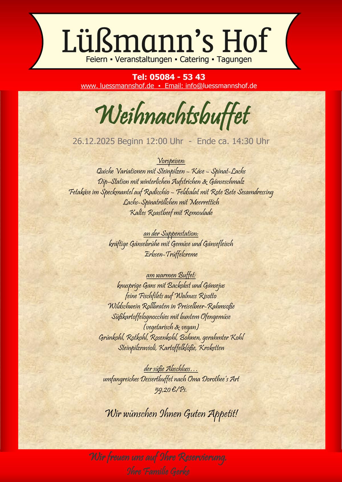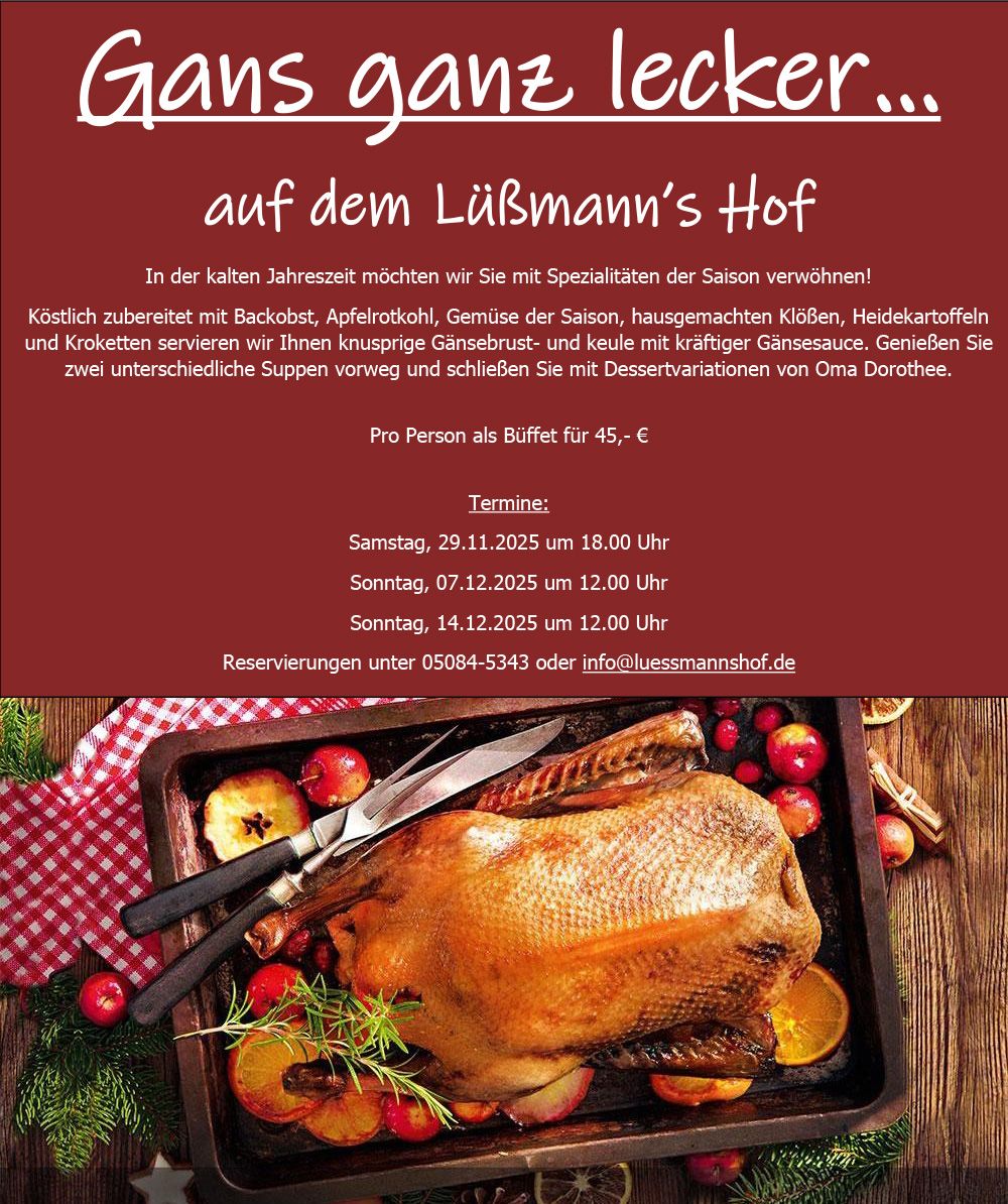 Ab dem 29. November bieten wir wieder drei Termine für unser bliebtes Gänse-Büffet. Leckere, knusprige Gänsebrust und Gänsekeule mit deftigen Beilagen: Ein Gaumengänseschmaus!